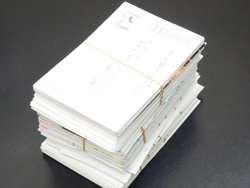 「合格コーール!!のハガキの束です。皆さん、受験(就活)お疲れ様でした!今週のラジオからコールを始めますので皆さんお聴き逃しなく!」